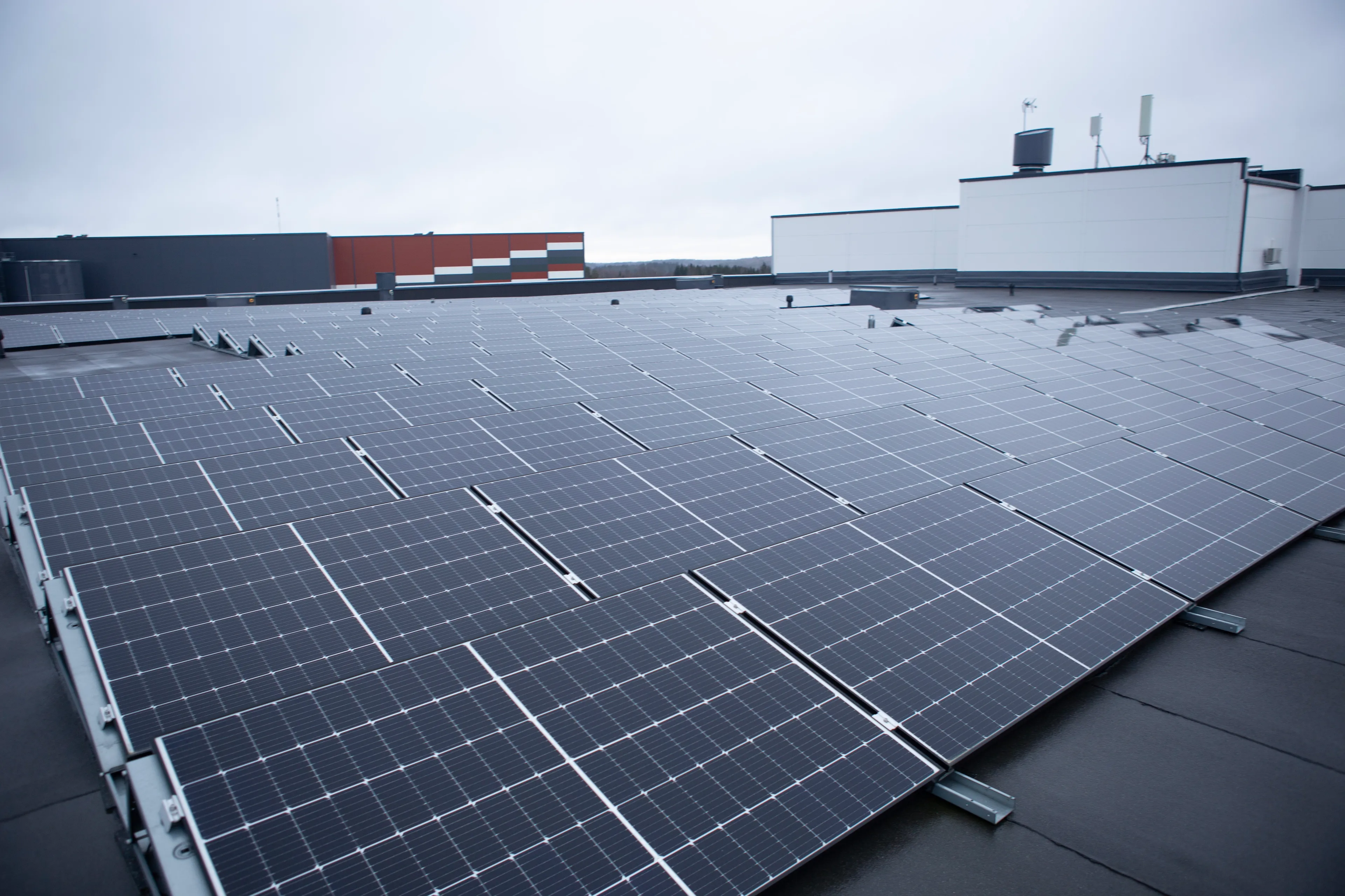 Our main warehouse roof in Turku has 220 kWp inverter capacity of solar panels. Additionally, both Tampere and Jyväskylä locations have 110 kWp inverter capacity each. These solar power plants produce a significant portion of our properties' energy needs.