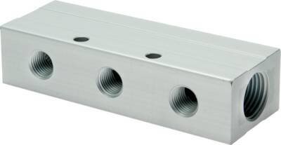 Alumiininen jatkotukki esim. paineilman tai veden jakamiseen. Lähtöliitännät jakotukin molemmin puolin.